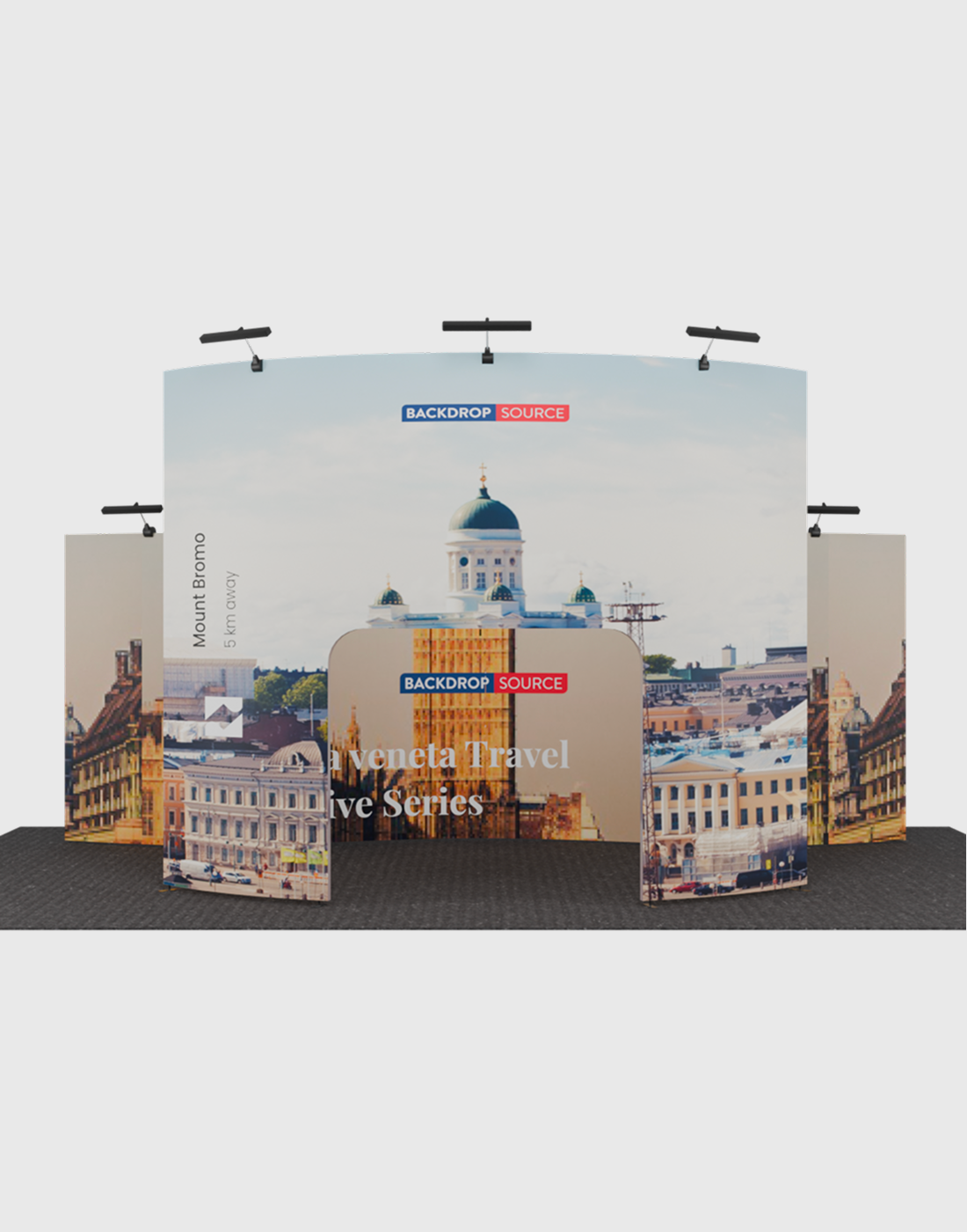 - Wave Line Backdrop : A wide, flowing fabric backdrop that adds movement and modern appeal—perfect for making a bold visual impact across large booth spaces.